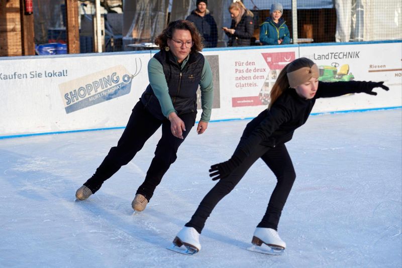 Zu Beginn stehen die Eltern noch gespannt an der Bande und schauen ihren Kindern zu. Handys werden gezückt, um die Eislauf-Momente der Kinder festzuhalten. Je länger der Unterricht dauert, desto mehr Eltern gehen Einkäufe erledigen oder einen Kaffee trinken. Nach zwanzig Minuten zeigt sich auch die Sonne, die langsam über dem Gebäude daneben aufsteigt. Die Sonnenstrahlen wärmen nicht nur die Gesichter, sondern bringen auf der glatten Eisfläche auch die Spuren der Kufen zum Vorschein.