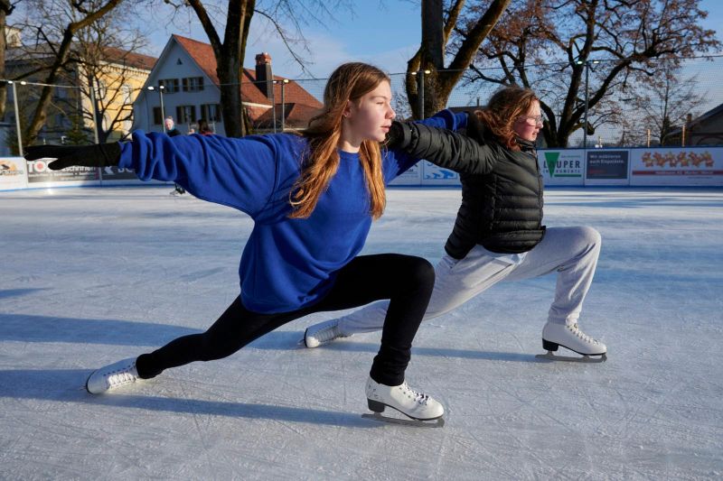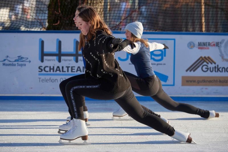 Nach rund 50 Minuten ist die erste Unterrichtsstunde vorbei. Kaum ist die erste Gruppe vom Eisfeld, kommt schon die nächste. Nun stehen die Fortgeschrittenen auf dem Eis. Mit ihnen kann Guggisberg mehr Elemente üben. Sie zieht ihre dicke Winterjacke aus, legt sie ab, und los gehts. Sie ist in ihrem Element auf dem Eis.