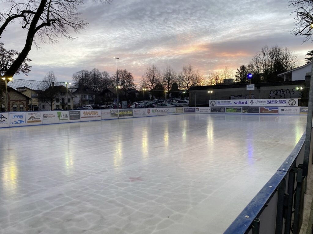 Um 8 Uhr morgens und bei minus zwei Grad ist noch niemand auf der Murtner Eisbahn anzutreffen. Die Sonne ist noch nicht bis auf die Eisfläche vorgedrungen, und es ist entsprechend kalt. Es ist ruhig an diesem Morgen, nur das Läuten der Glocken des Berntors ist zu hören.